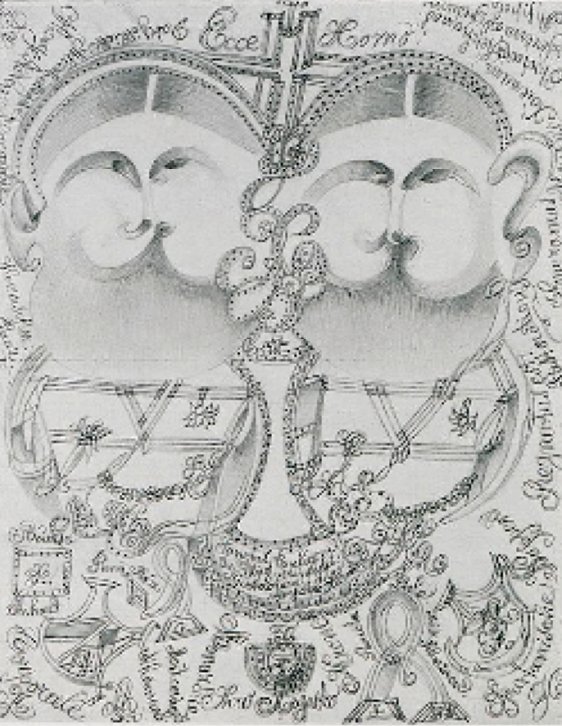 Figure 14: Mirroring motif, monstrosity, labyrinth: "Ecce Homo" (pencil) 33 x 42 cm (slide 36).30